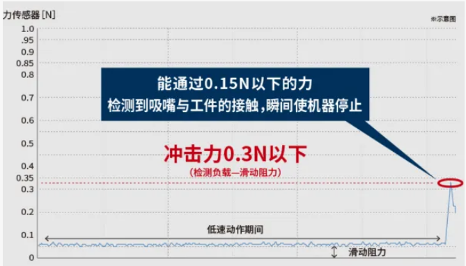 通過(guò)THK獨(dú)特的力傳感技術(shù) (*1) ,可以檢測(cè)到至今難以實(shí)現(xiàn)加工接觸中的微小力。此外,通過(guò)反饋控制可實(shí)現(xiàn)快速操作和減少工品損傷。力傳感器的分解能為0.01 N,當(dāng)使用接觸停止功能時(shí),可對(duì)工品的沖擊抑制到0.3 N或更小 (*2) 。