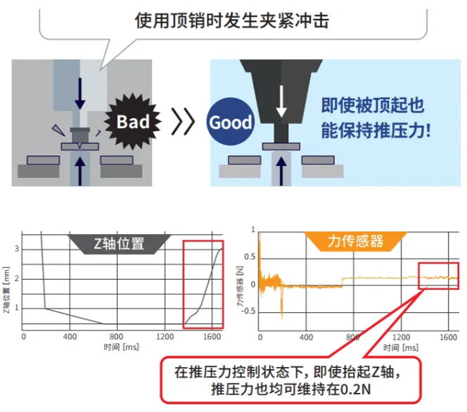 現(xiàn)有機(jī)構(gòu)頂針和吸嘴的同期動(dòng)作協(xié)調(diào)困難,造成夾緊力過(guò)大。如果使用PPR,頂起同時(shí),釋放頂緊力吸收過(guò)大夾緊力,即使頂升工件,也可以保持推壓力恒定,通過(guò)位置和力傳感器信息的智能反饋來(lái)優(yōu)化夾緊力。