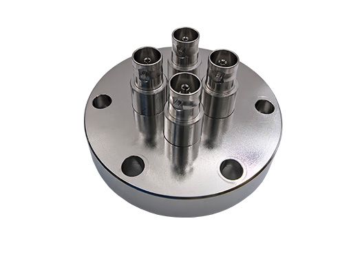 作為BNC同軸饋通的變體,MHV同軸饋通采用嵌入式引腳,將額定電壓提高至5KV,采用接地屏蔽方式,阻抗匹配不固定,可選MHV單端饋通或MHVD雙端饋通。單端饋通導體直徑為2.4mm,雙端饋通采用MHV接口。最大電流3A,溫度范圍-200~450℃,極限真空<1E-10mbar。CF16法蘭可兼容該饋通數量為1,CF40法蘭最多可兼容MHV單端饋通的數量為4,可根據需求定制法蘭饋通,或選擇可焊接版饋通。相關配件可選饋通兩端的連接器及線纜。